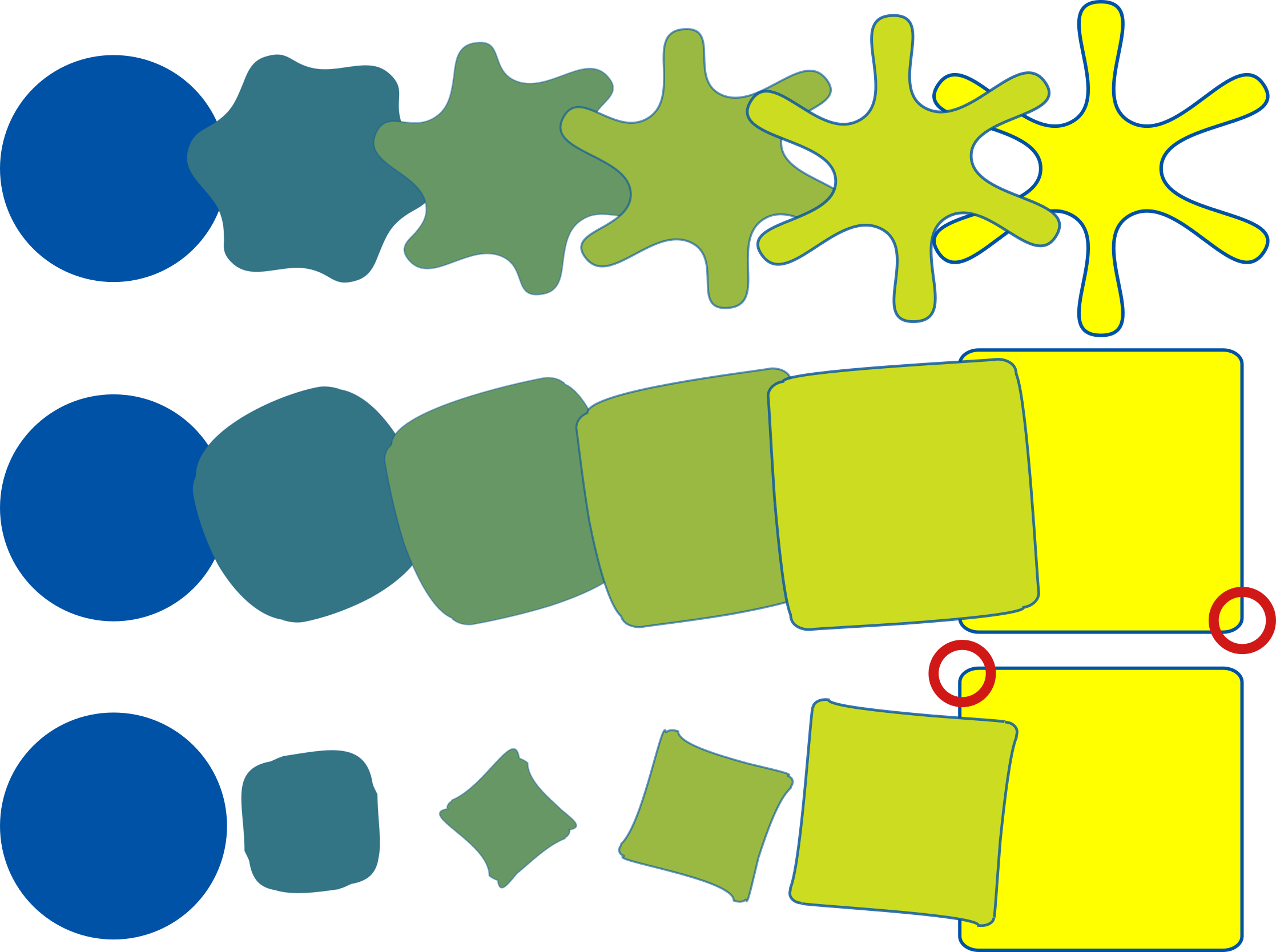 Beim Interpolieren wird ein Pfad schrittweise in einen anderen umgewandelt. Und dabei kann man auch noch wählen, wie viele Transformationsstufen man haben und sehen möchte. Wenn die beiden Ausgangspfade unterschiedliche Formen und Farben haben, wird sowohl Form als auch Farbe schrittweise angepasst.