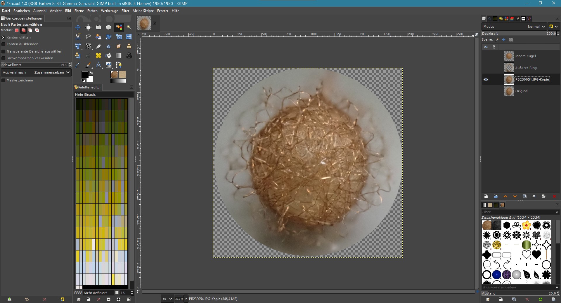Und nun mit der bestehenden Auswahl und der aktivierten neuen Ebene "aus Sichtbarem" kopieren. So hast du deinen fertigen Konkon und kannst ihn beliebig im Baum einsetzen, vervielfältigen, vergrößern und verkleinern, und falls erwünscht, das eine oder andere Exemplar noch etwas heller, dunkler oder wie auch immer machen, damit nicht alle Kugeln 100%tig gleich ausschauen.