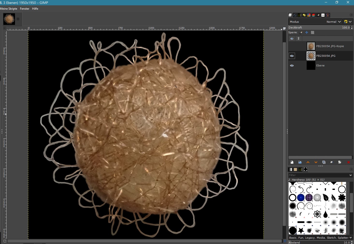 Das mittlere ist mit farbigeren Fäden, und das rechte habe ich mit einem Filter von Windows Fotos (wie´s mit Gimp geht weiß ich noch nicht) bearbeitet, weil mir die ganze Kugel nicht kräfig genug war.