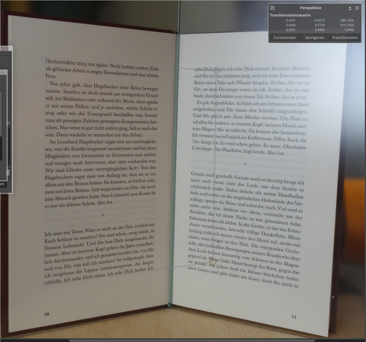 Ich möchte Bücher scannen. Dazu fotografiere ich jeweils zwei Seiten durch Glasplatten, die zur Schonung des Buchrückens etwas gegeneinander abgewinkelt sind. So jedenfalls machen es Profiscanner. Weil ich nur eine Kamera benutze will ich im nächsten Schritt jedoch die Perspektive jeweils für die linken und rechten Seiten anpassen.