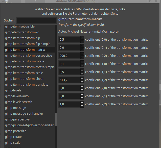(1) der Name der Gimp-Funktion erschliesst sich nicht aus der prototypischen Verarbeitung per GUI: Ich nehme aber an, dass mit Werkzeuge->Transformation-> Perspektive die Funktion gimp-item-transform-matrix gemeint ist. Stimmt das im Speziellen und wie kann ich im Allgemeinen die Verbindung zwischen GUI-Manipulation und Gimp-Funkionsaufruf herstellen?