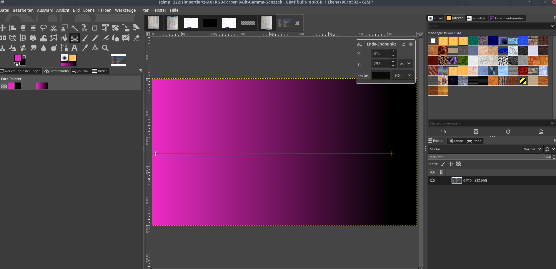 Aber - und dieses Verhalten das stelle ich soeben fest - auf einem zweiten notebook - auf dem auch GIMP installiert ist. Da ist links nicht das Arbeiten mit dem Farbgradient-tool typische Bild mit den vielen vielen