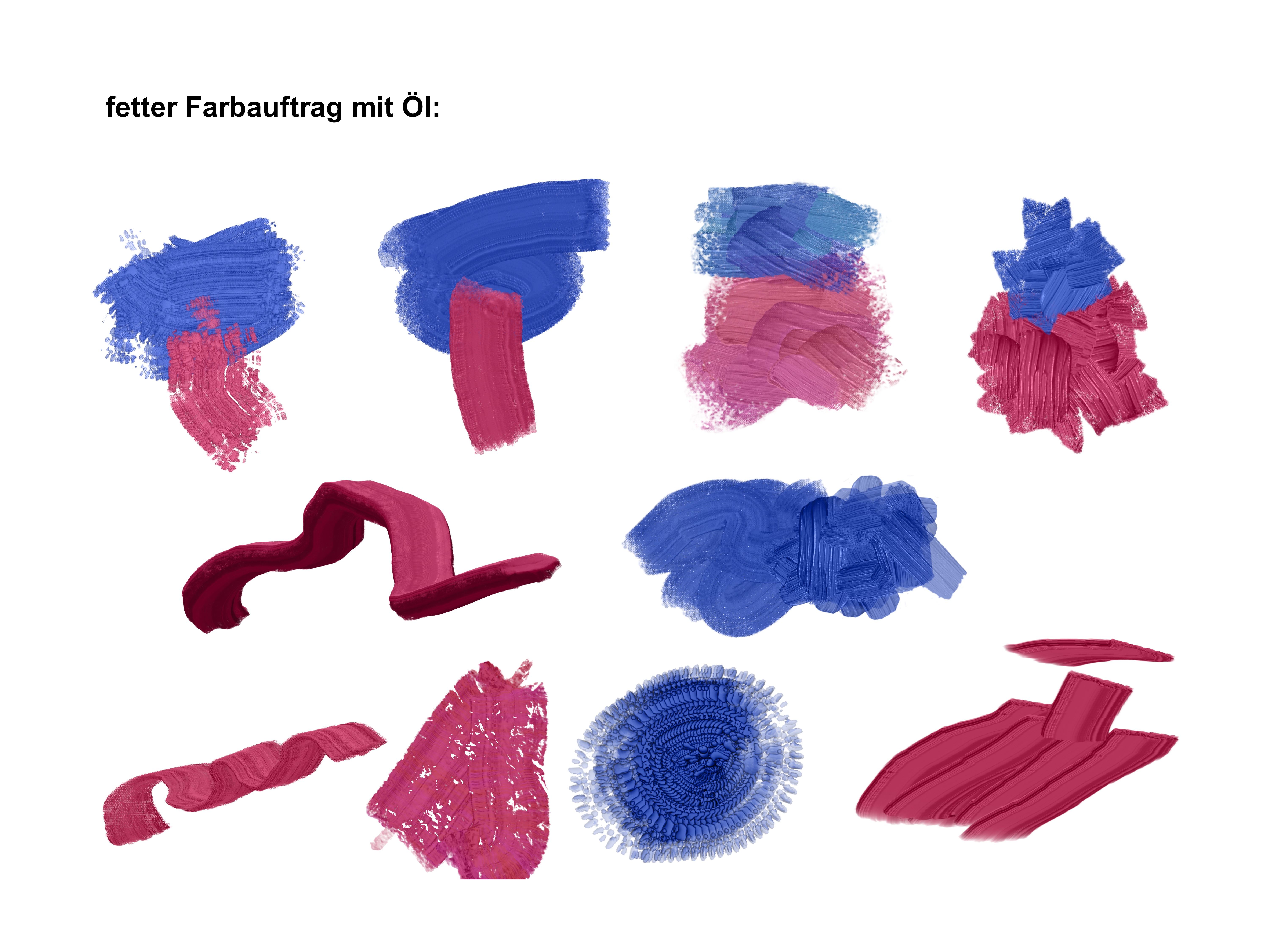 Im Unterschied zum durchscheinenden Aquarell, bei dem Fehler im Nachhinen nur schwer zu korrigieren sind, lässt sich Öl immer wieder deckend übereinander auftragen. Da ist es ähnlich wie Akryl. Nur, dass Öl sehr langsam trocknet. Insofern lassen sich Farben, wenn gewünscht, vor Tocknung noch auf der Leinwand vermischen. Oder man gedultet sich und wartet die Trocknung ab, bevor die nächste Schicht deckend aufgetragen wird. (Digital erübrigt sich natürlich die Wartezeit. :mrgreen: ) Und Öl lässt sich mit fetten Pinselstrichen und dadurch mit einer erkennbaren Textur auftragen. Unten mal ein paar Beispiel. Die Pinsel sind bewusst groß gewählt. Nicht weil es unbedingt schön ist, sondern weil es die Pinselstruktur so deutlich zeigt. Auch die Farben sind nicht sehr attraktiv gewählt. Aber es zeigt, was es zeigen soll. Und ich finde die Pinsel schon sehr praktikabel und realitätsnah.