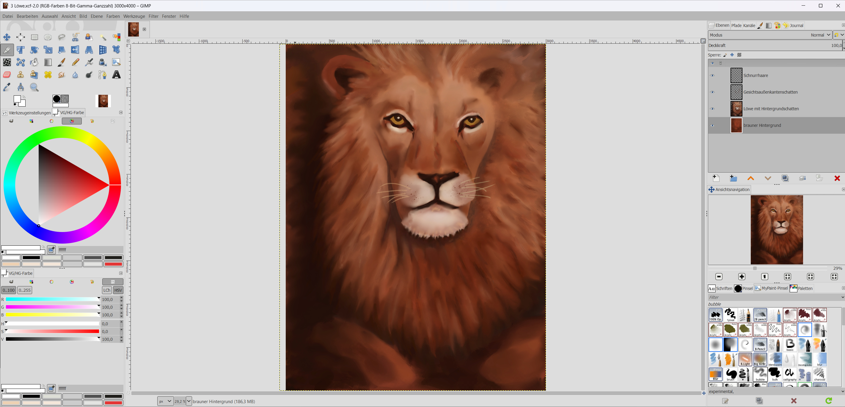 Es ist schwierig Dinge zu beurteilen, bzgl. denen man nicht mit allen Wassern gewaschen ist. Mit Gimp habe ich speziell beim Malen keine sehr umfassenden Erfahrungen gemacht. Was ich auf jeden Fall sehe, ist dass Gimp mit den Standardpinseln und den MyPaint-Pinseln viele schöne Pinseleffekte anbietet. Aber es erscheint mir etwas unübersichtlich. Einmal durch die Vielzahl der Pinsel, die ich nicht frei und getrennt voneinander in Kategorien sortieren kann. Und zum anderen, weil die Standardpinsel und die MyPaint-Pinsel in unterschiedlichen unterschiedlich Dialogfeldern zu bearbeiten und zu steuern sind.