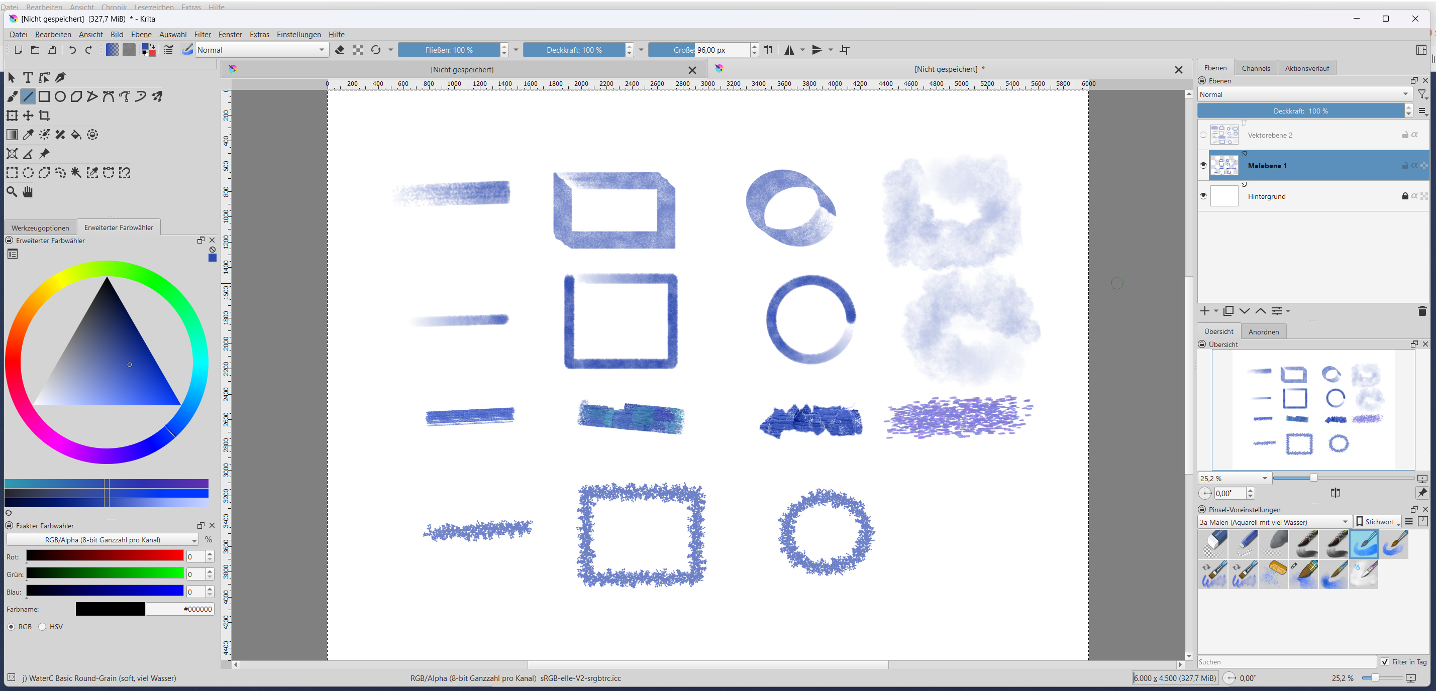 Man könnte viele, tolle und auch verrückte Krita-Pinsel demonstrieren. Aber ich will mal exemplarisch zwei Beispiele zeigen: