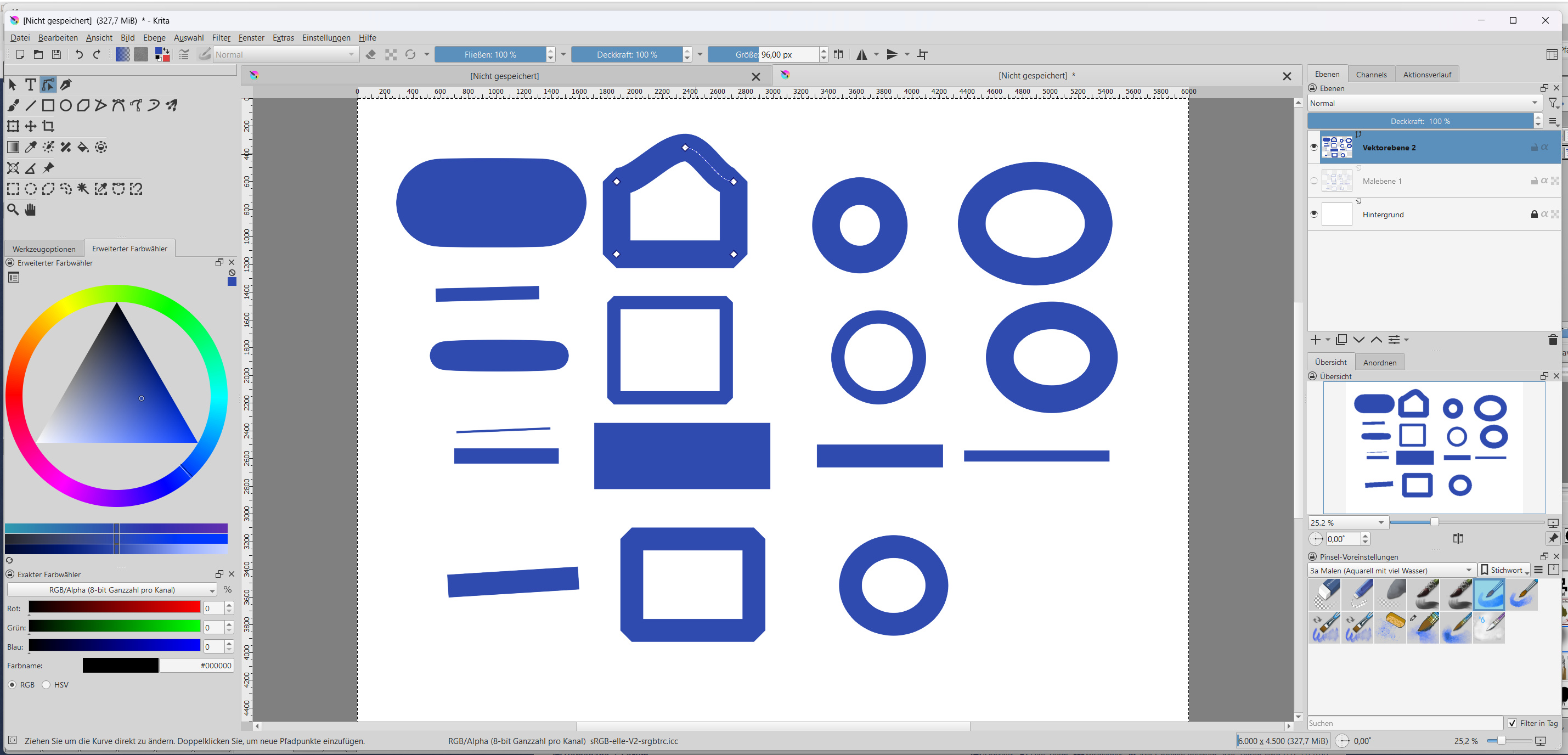 Ganz oben sind die Vektor-Werkzeuge. Die funktionieren nur auf Vektorebenen. Krita hat Vektor- und Malebenen. Und natürlich auch noch Maskenebenen und das ganze Zeug. Aber die Vektorebene ist sehr geschickt. Mit Vektoren arbeitet es sich nicht so gut wie in Inkscape, aber doch leichter als bei Gimp.