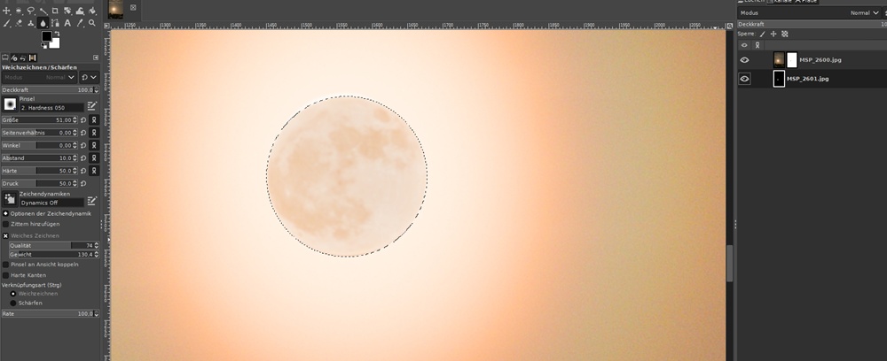 Ich habe zwei Bilder und zwei Ebenen. In Bild eins habe ich einen Kreis ausgeschnitten, so dass hier Bild 2 zu sehen ist. Das ist ein Bild vom Mond.