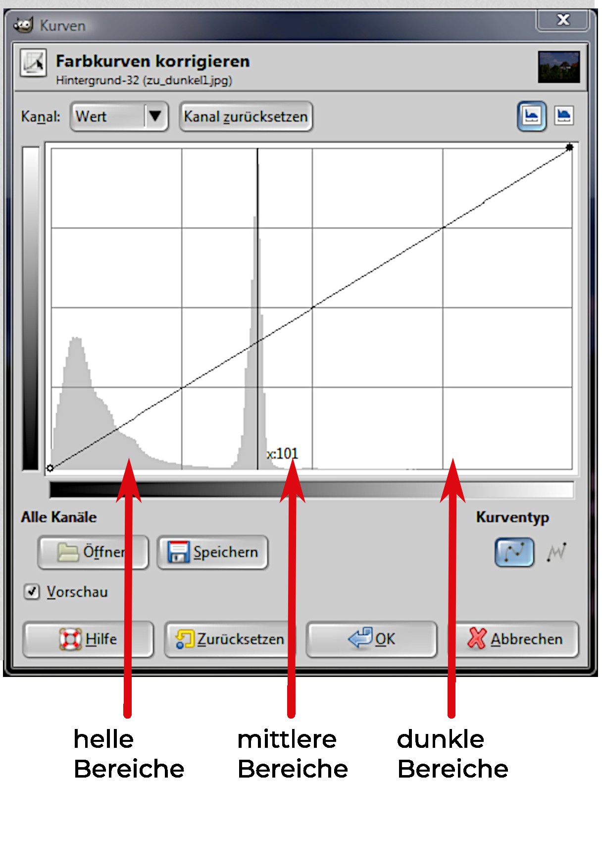 Die "Hügellandschaft" im Dialogfeld-Koordinatenkreuz zeigt die Anteile eines Bildes an hellen und dunklen Farb- oder Schwarzhalbtonbereichen. Die auf der x-Achse links stehenden Teile sind aus sich heraus schon hell. Glanzlichter, Farben die im Licht stehen, etc. Und rechts sind die dunklen Anteile. In der Senkrechte sieht man die tatsächliche, aktuelle, relative Helligkeit. Am Anfang steht daher immer eine diagonale Gerade da. X-Achse entspricht y-Achse. Logisch, hell ist hell, dunkel ist dunkel und mittlere Helligkeit ist mittlere Helligkeit des Originalbildes. Wenn du die Kurve nun links anhebst werden die dunklen Bereiche heller. Wenn du die Mitte anhebst wird die mittlere Helligkeit heller. Und wenn du den rechten Bereich absenkst wird der helle Bereich dunkler. Verstehst du? Man braucht ein bisschen um sich reinzudenken. Aber dann ist es ganz einfach. Jedenfalls kannst du die Bildhelligkeit sehr differenziert manipulieren. Und wenn du ein Häkchen bei Vorschau setzt, siehst du immer gleich, welche Effekte du verursachst.
