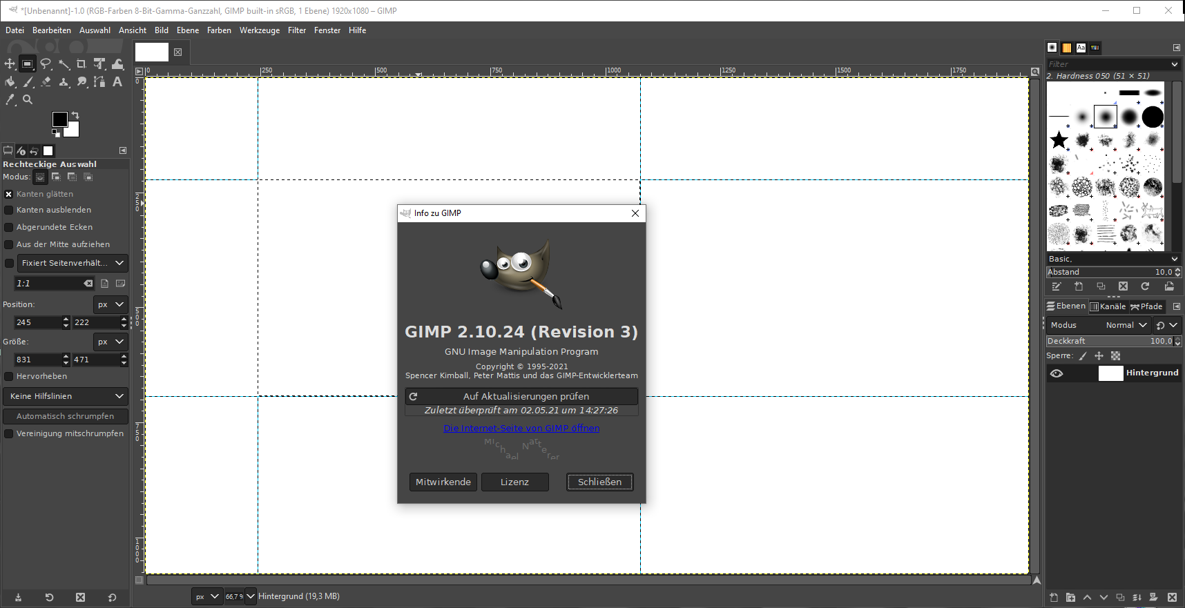 Das zurücksetzen der Werkzeugeinstellungen hat auch nichts gebracht. Ich hab jetzt mal GIMP deinstalliert und mir nochmal (wie zuvor auch von der Original Seite) die Installationsdatei gezogen. Mein Download war damals vom 04.04.2021, am 07.04.2021 kam eine neue Version raus.Eibauoma hat geschrieben: So 2. Mai 2021, 12:36 Eine neue Gimpversion sollte von der Originalseite geladen werden, also von hier