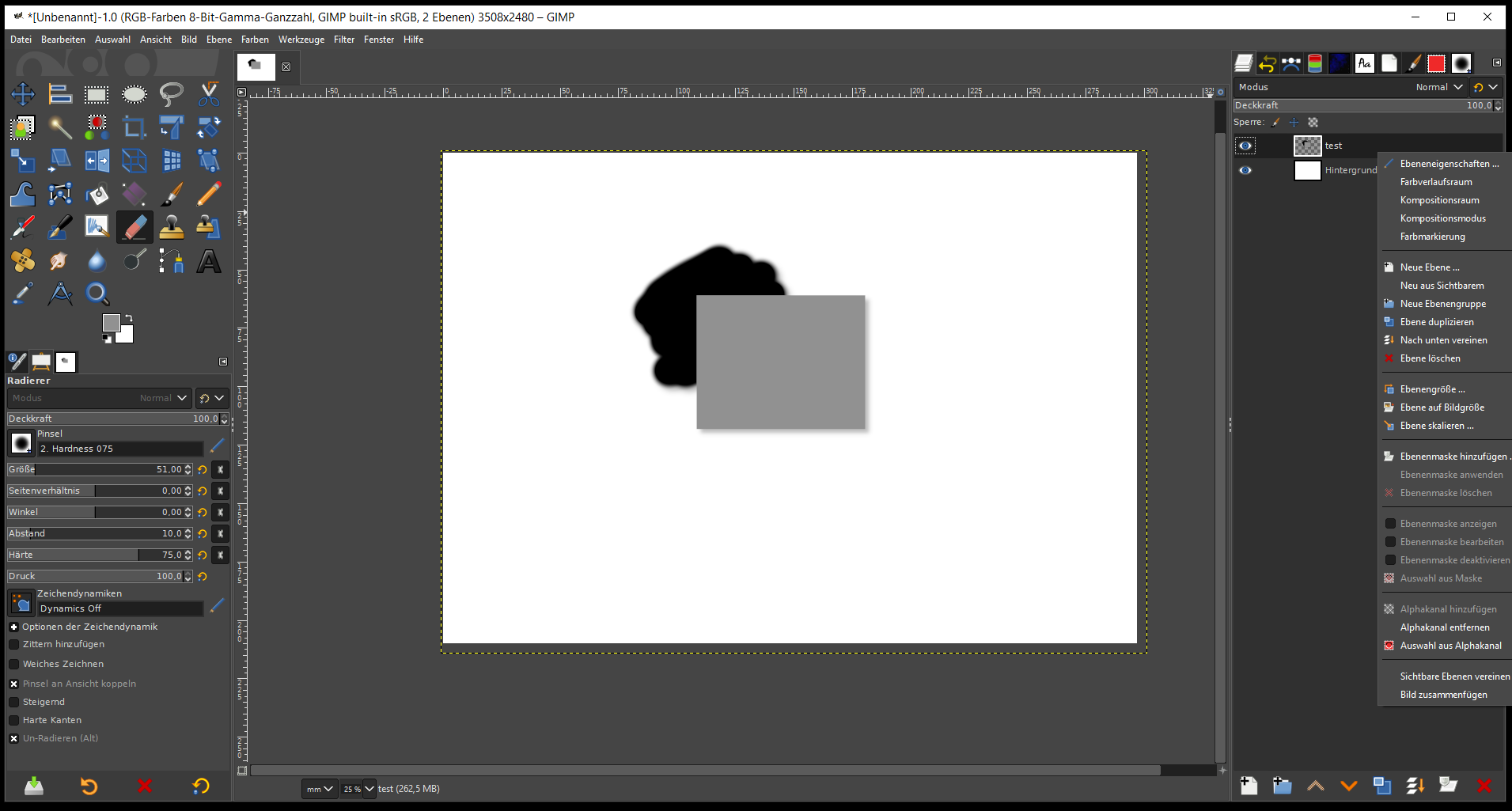 Falls Du auf der einzigen Ebene radieren willst und der Alphakanal vorhanden ist , wird das Radierte transparent (das Karomuster ist in diesem Bereich sichtbar.