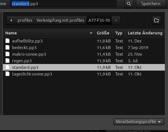 Gehen wir nun zurück zu Bearbeitungsprofile im rechten Fensterteil ganz oben. Dort können mit dem Schalter "Profil speichern" (3. Icon) eigene Profile abgelegt werden. Es öffnet zunächst ein Datei-Manager, in dem ein geeigneter Ordner angelegt werden sollte.