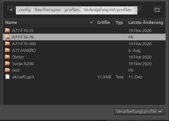 Nach einer längeren Foto-Tour mit unterschiedlichen Objektiven und Lichtverhältnissen sind nun alle Fotos auf dem PC. Natürlich in RAW-Format. Nun beginnt eine langwierige Arbeit. Angeregt von der Anleitung in der Hilfe (RT) habe ich mir eine Sammlung unterschiedlicher Profile zusammengestellt. Dies ist der nächste Schritt.