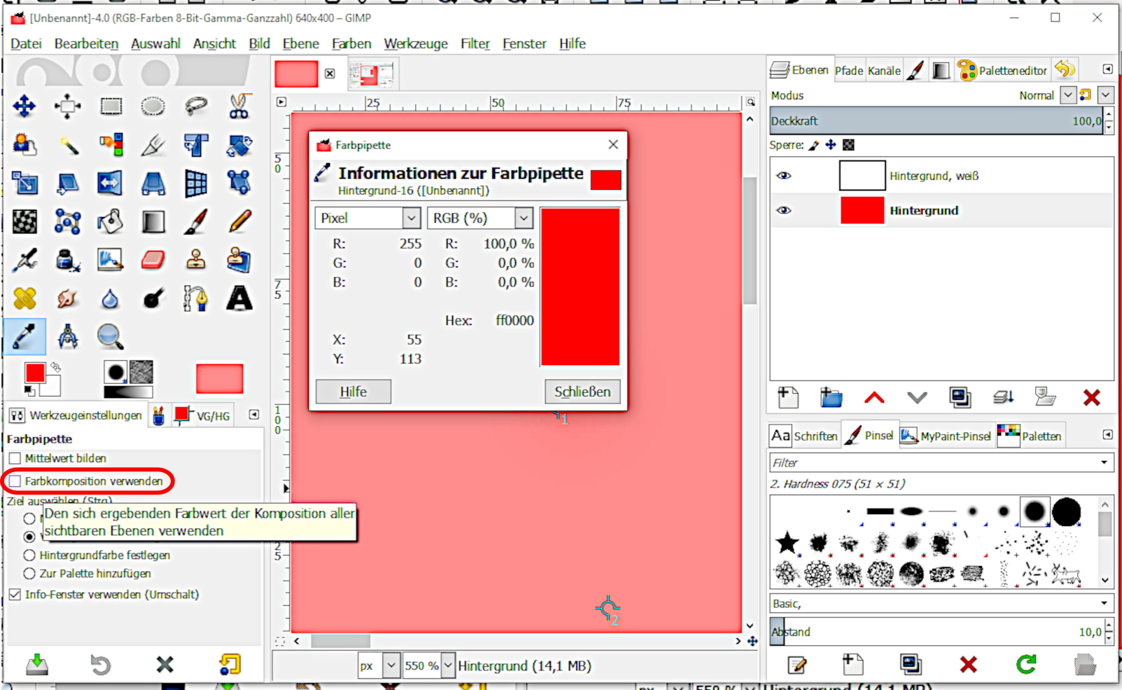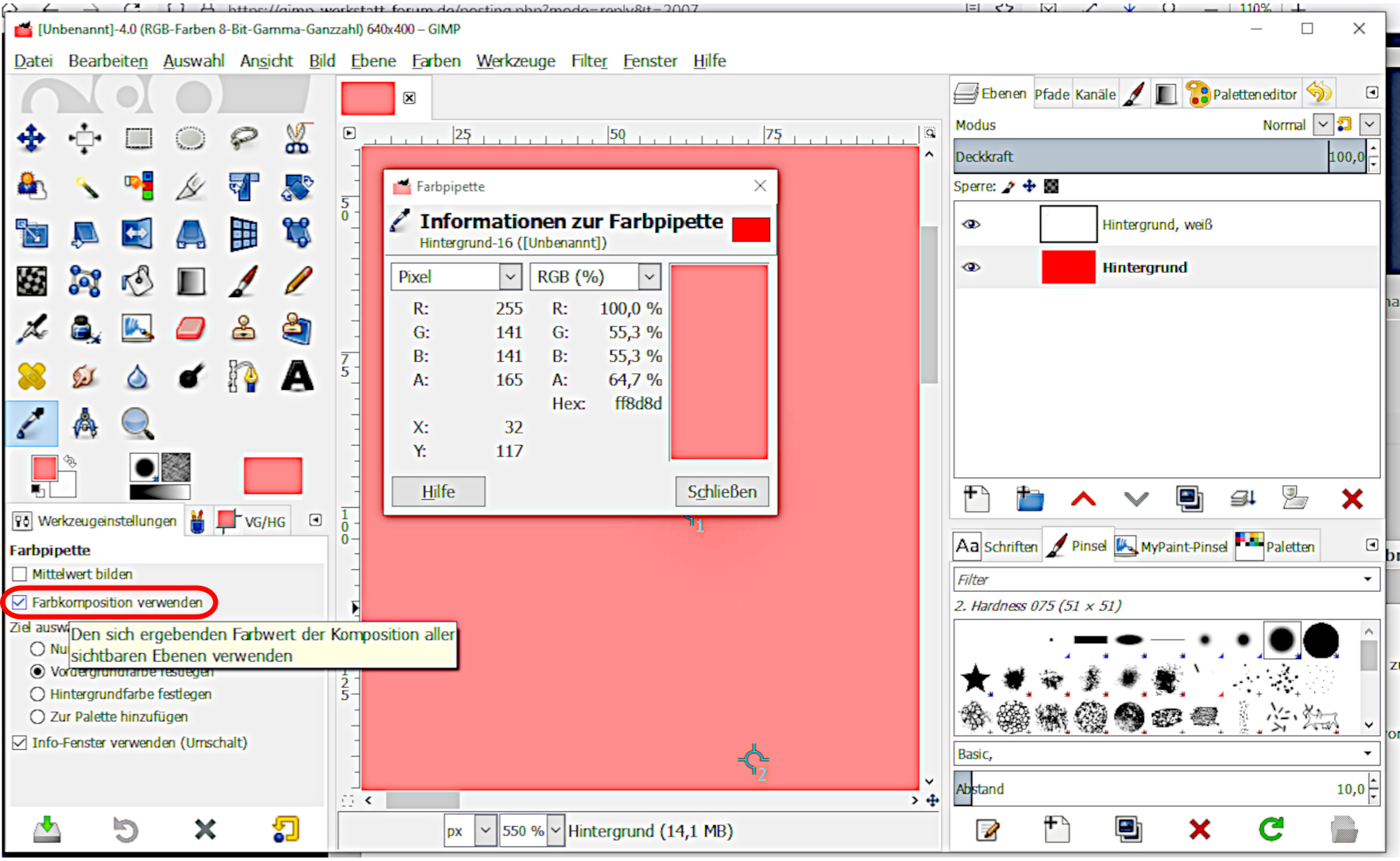 1. Weiße, teiltransparente Vordergrundebene vor roter Hintergrundebene mit Auswahl "Farbkomposition verwenden": 2. Weiße, teiltransparente Vordergrundebene vor roter Hintergrundebene ohne Auswahl "Farbkomposition verwenden": Wie man sieht, habe ich in der Pipetten-Werkzeugeinstellung "Infofenster verwenden" aktiviert. Dort kann man je nachdem, welche Informationen gewünscht sind, weitere Einstellung vornehmen.