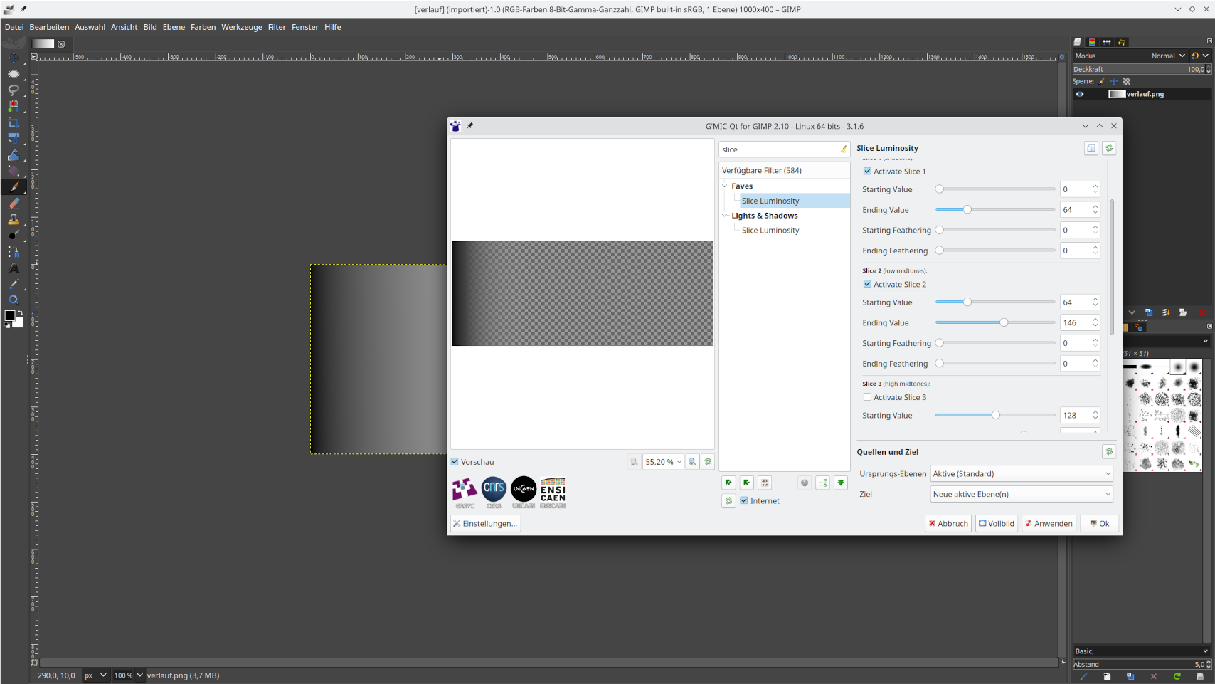 Da man bei der Vielzahl an Filtern in GMIC hin und wieder den Überblick verlieren kann, einfach mal im Suchfeld "Slice" eingeben.