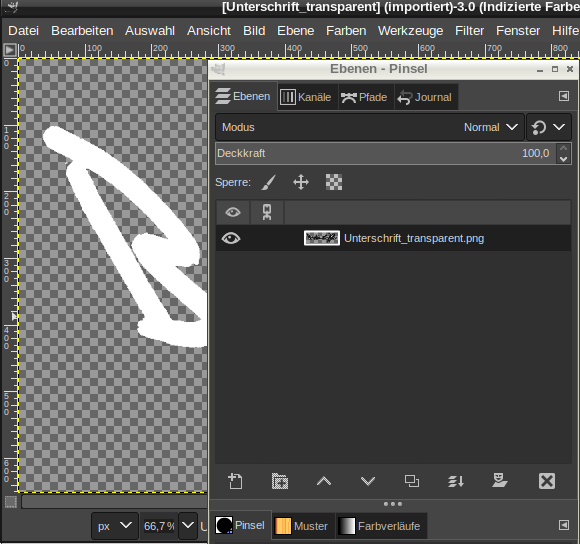ich habe eine Strichzeichnung für die ich einen transparenten Hintergrund erzeugen möchte. Ich nutze Ebene -> Tranparenz -> Farbe nach Alpha und wähle weiß als transparente Farbe. Klappt super die Vorschau sieht gut aus, der Hintergrund hat Karo-Muster. Fix Exportieren als png ... Und beim Wieder-Einlesen sind alle schwarzen Striche plötzlich weiß? Was mache ich hier falsch?
