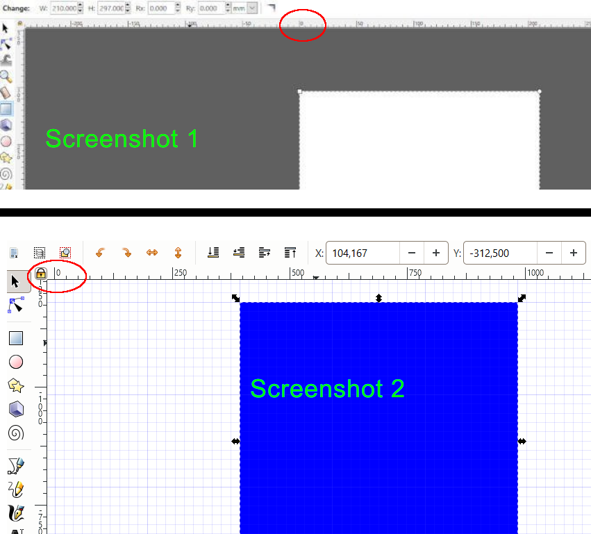Eben sah ich mir ein altes Tutorial an zur Anpassung der Zeichenfläche in Inkscape. Man erkennt, daß der Nullpunkt des waagerechten Lineals um einiges nach rechts verschoben ist (Screenshot 1 im Bild).