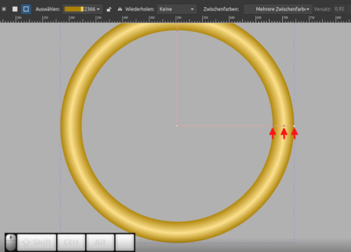 Dann doppelklickst du auf die Linie am inneren Rand, damit setzt du dort einen Stop (so haut die Farbe nicht weiter ab). Dann nochmal einen Doppelklick in der Mitte. (Die Punkte sind winzig klein, schwer zu sehen, vergrößere dir die Ansicht am besten).