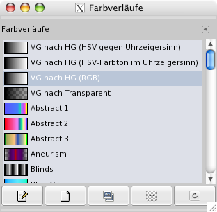 und der sog. gradient-editor - der ist hier wohl das Tool, das ganz wichtig ist.Mit dem Farbverlaufsdialog können Sie den gerade aktiven Farbverlauf wählen. Dieser wird unter anderem von dem Farbverlaufswerkzeug verwendet. Den gewählten Verlauf sehen Sie im Werkzeugfenster in der Farb- und Werkzeugübersicht. Über 50 verschiedene Farbverläufe sind in GIMP bereits vorinstalliert. Über den Farbverlaufseditor können Sie neue erstellen beziehungsweise vorhandene bearbeiten. Grundsätzliche Informationen zu der Verwendung von Farbverläufen finden Sie im Abschnitt 10, „Farbverläufe“.