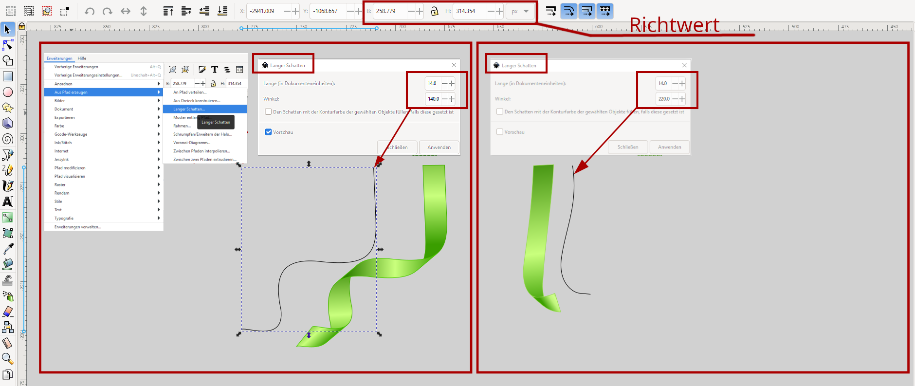 hier ein Screenshot zu meiner Umsetzung des Bandes mit Inkscape: Beachte aber, dass die Einstellung des Filters "Langer Schatten" von der Form und Größe des Pfades abhängig ist. Diese Einstellungen muss man dann an eigene Formen und Größen anpassen. Es sind keine Vorgaben und Experimentieren ist hier angesagt!