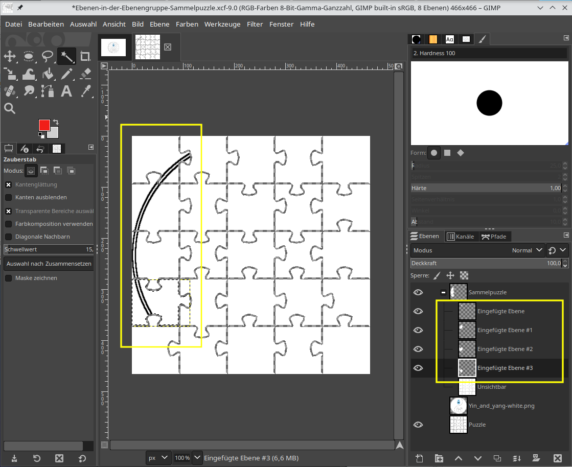 - mit dem Tastenkürzel XY die kopierte Auswahl in die Ebenengruppe "Sammelpuzzle" als seprate Ebene einfügen