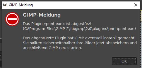 ich wollte ein Bild mit Gimp drucken, aber ich erhalte ständig die Fehlermeldung, dieses plugin sei abgestürzt.