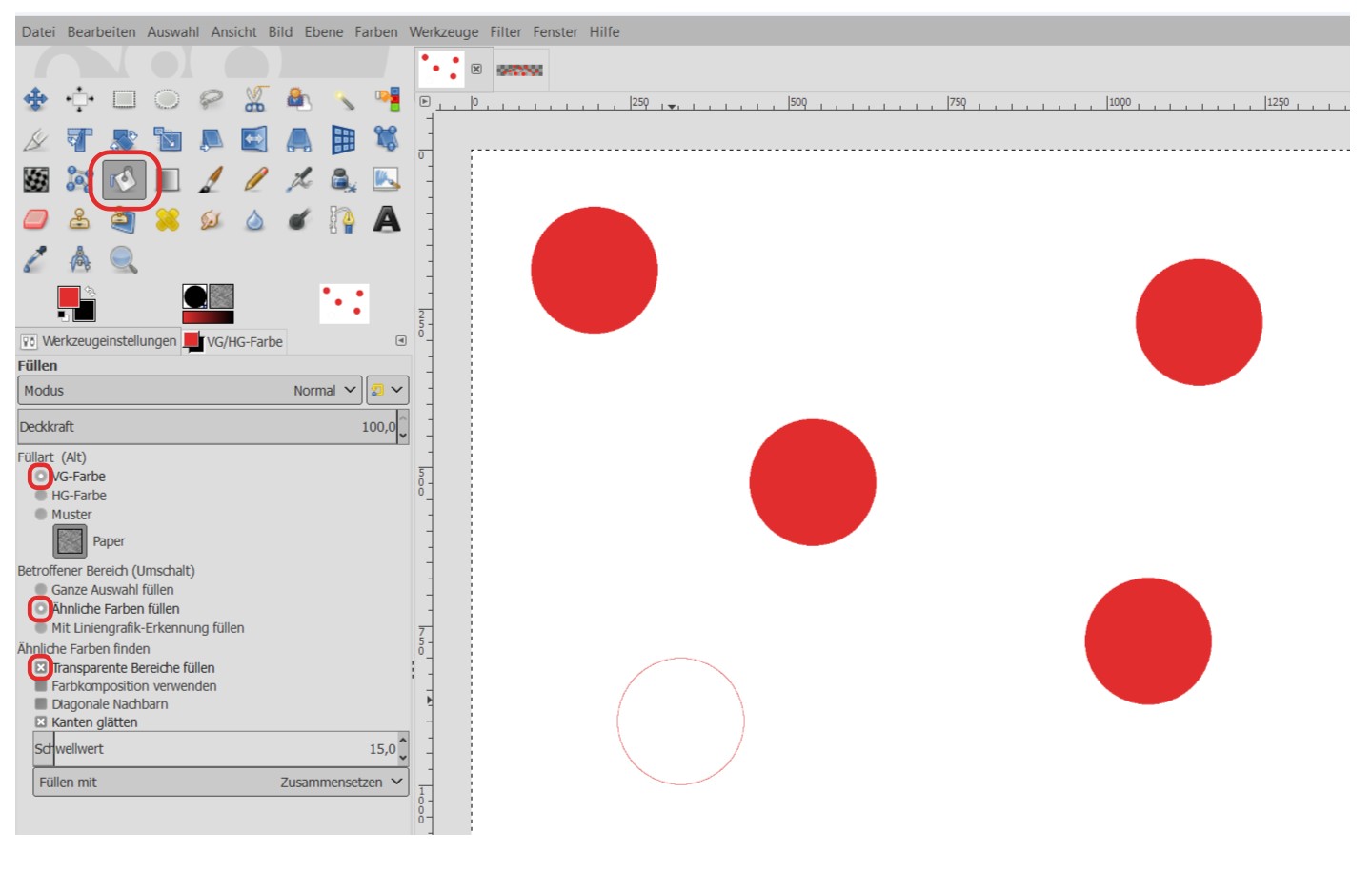 4. Den Mauszeiger über den gewünschten Kreis führen und klicken, um den Farbeimer über dem Kreis "auszugießen". Das wiederholst du bei allen gewünschten Kreisen.