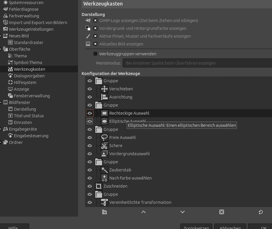 das Auswahlwerkzeug verhält sich bei mir sehr sehr merkwüridig. Jedesmal wenn ich in einer Grafik eine Auswahl treffen will mit dem "rechteckigen" - Auswahlwerkzeug, und sagen wir von einer Bildmitte heraus einen Bereich auswählen will -. dann ändert sich der -Bezugsrahmen an mehreren Seiten geichzeitig. Das Verhalten - das nervt mich ehrlich gesagt - es geht gewissermaßen immer irgendwie " konzentrisch " über die Fläche - und allermeist ists ein echtes Glückspiel in einer halbwegs angemessenen Zeit einen Rahmen um ein Grafikobjekt zu setzen.