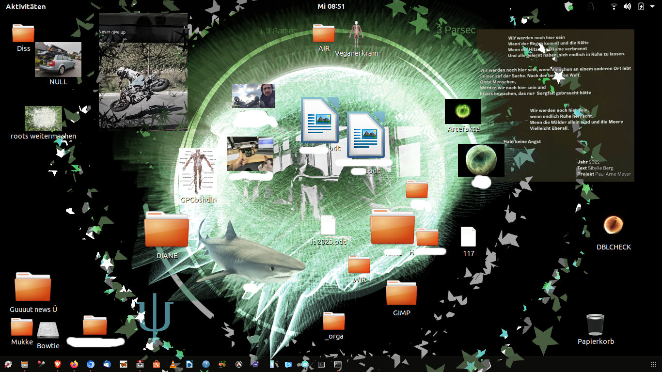 wollt hier nurmal nebenbei so als Idee beisteuern, wie Ich so mein Desktop immer wieder versuch frisch mit Leben zu füllen ... Farbänderungen, mal hier oder da ein Gedicht, symbol oder eine Momentaufnahme mehr oder weniger ... das funktioniert als Collage mit neuen und alten Geschichten relativ gut auch mit der täglichen Ordnung auf was an Daten Ich so meinen Fokus legen mag.