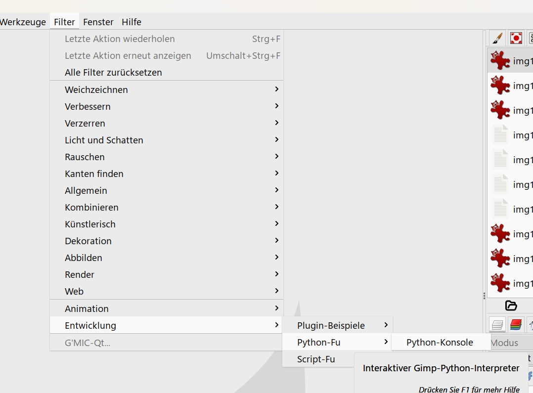 Erkennbar, wenn du unter Filter > Entwicklung > Python-Fu > Python-Konsole findest.